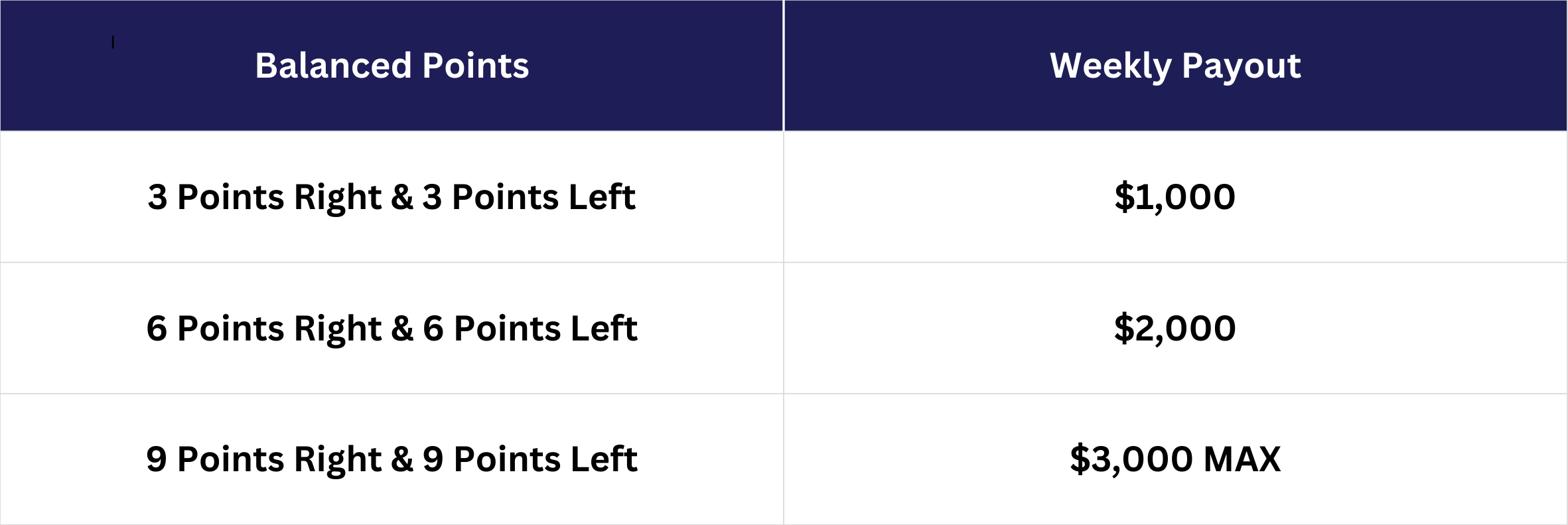 Any points above 9 on either side get washed away, as the maximum is 9. For example, if you had 6 points on your left side and 3 on your right, you would earn a $1,000 commission that week because you matched 3 points on your left and right sides. The remaining 3 unused points on your left side will stay until you match them for another commission. Points reset every week.
